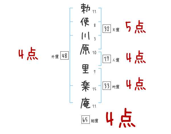 天運![]() | 勅使川原里楽庵さんの天運は32画の5つ星!柔軟性があり成功する。チャンスが多く金運が良い。 家系が持つ宿命的な運勢を表します。祖先から受け継いだ苗字ですので自分の力が及びません。家柄を象徴します。 |