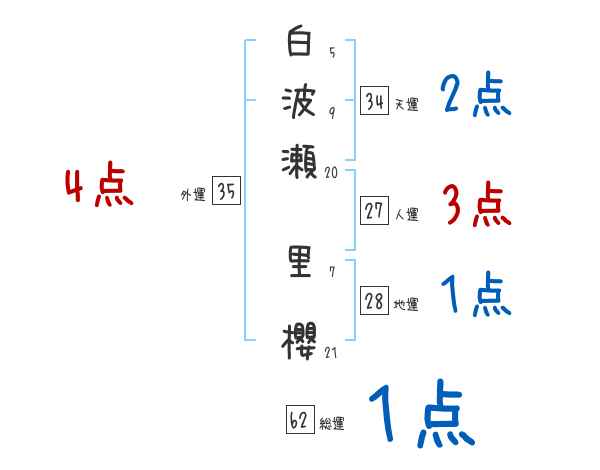 外運![]() | 白波瀬里櫻さんの外運は35画の4つ星!温厚な性格で感受性が高い。穏和な性格で人望が厚い。 生活面を象徴する運勢です。外部から受ける影響力を表し、結婚運、家庭運や職場、環境への順応性を表します。 |