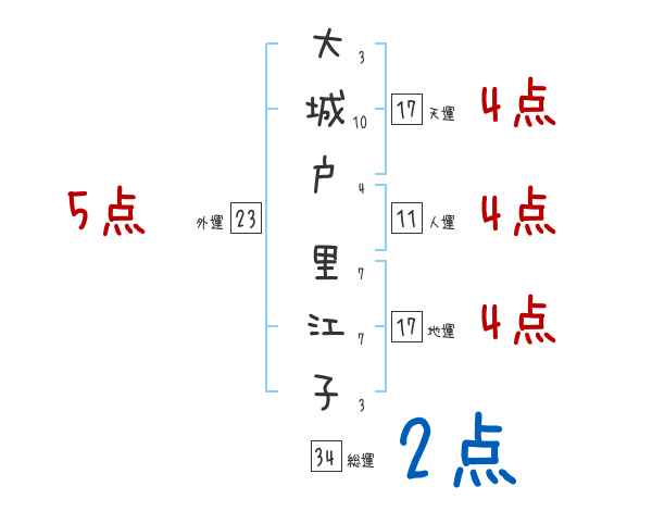 総運![]() | 大城戸里江子さんの総運は34画の2つ星!独創性に優れるが、自尊心が強く災難に注意しましょう。 あなたの人生を表す1番重要な運勢です。生涯を通じて影響する総合運となり、主に50歳以降の晩年期に影響を及ぼします。 |