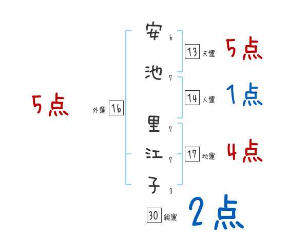 外運![]() | 安池里江子さんの外運は16画の5つ星!人望が厚く大きく発展する。逆転成功が見える。 生活面を象徴する運勢です。外部から受ける影響力を表し、結婚運、家庭運や職場、環境への順応性を表します。 |