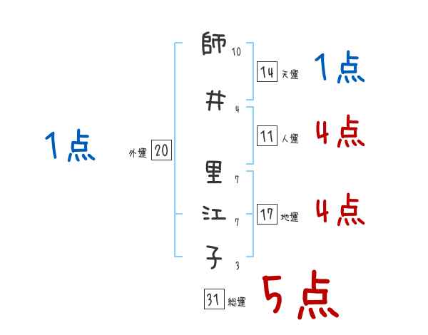 人運![]() | 師井里江子さんの人運は11画の4つ星!着実に富や地位を得る幸運な人生。 性格や才能などを表す2番目に重要な運勢です。人間関係や協調性、社会的な成功に影響します。主に20歳から50歳ぐらいまでの中年期の運勢を表します。 |