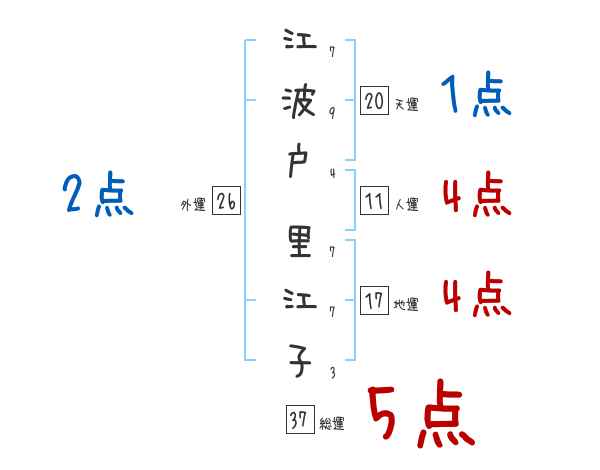 外運![]() | 江波戸里江子さんの外運は26画の2つ星!波瀾万丈かも。信頼できる人を大事にしましょう。 生活面を象徴する運勢です。外部から受ける影響力を表し、結婚運、家庭運や職場、環境への順応性を表します。 |