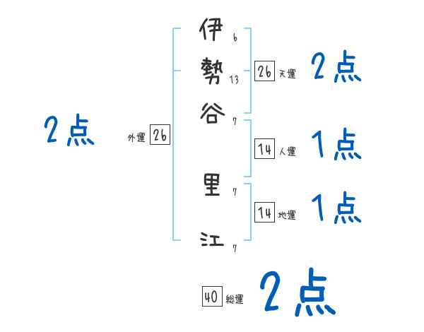 外運![]() | 伊勢谷里江さんの外運は26画の2つ星!波瀾万丈かも。信頼できる人を大事にしましょう。 生活面を象徴する運勢です。外部から受ける影響力を表し、結婚運、家庭運や職場、環境への順応性を表します。 |