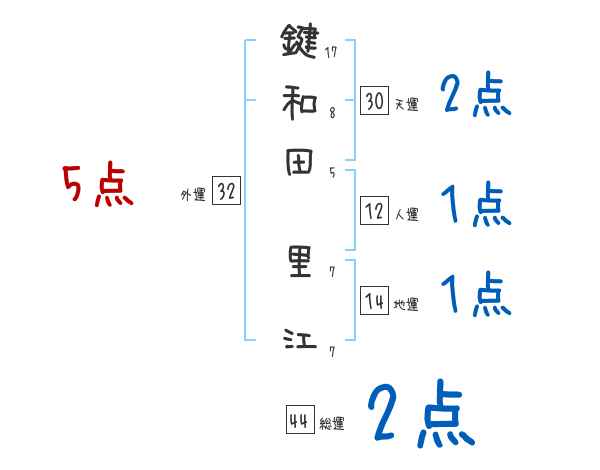 外運![]() | 鍵和田里江さんの外運は32画の5つ星!柔軟性があり成功する。チャンスが多く金運が良い。 生活面を象徴する運勢です。外部から受ける影響力を表し、結婚運、家庭運や職場、環境への順応性を表します。 |