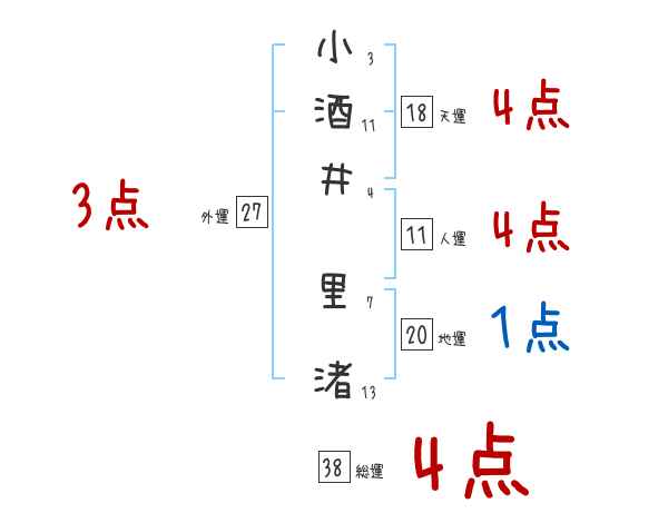 天運![]() | 小酒井里渚さんの天運は18画の4つ星!情熱的で剛気。忍耐力があり信頼される。 家系が持つ宿命的な運勢を表します。祖先から受け継いだ苗字ですので自分の力が及びません。家柄を象徴します。 |