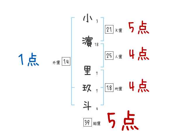 天運![]() | 小濵里玖斗さんの天運は21画の5つ星!統率力がある。独立し成功する。名誉を手に入れる。 家系が持つ宿命的な運勢を表します。祖先から受け継いだ苗字ですので自分の力が及びません。家柄を象徴します。 |