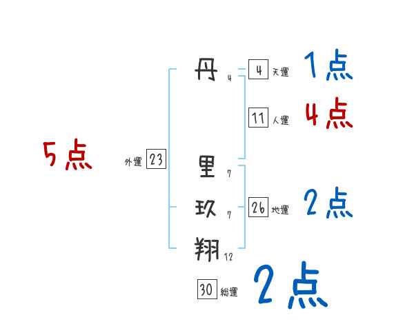 天運![]() | 丹里玖翔さんの天運は4画の1つ星!感情が不安定で苦労するかも。周囲との協調を心掛けましょう。 家系が持つ宿命的な運勢を表します。祖先から受け継いだ苗字ですので自分の力が及びません。家柄を象徴します。 |