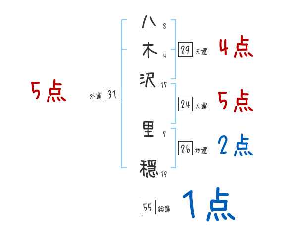 総運![]() | 八木沢里穏さんの総運は55画の1つ星!欲張りな性格で軽率な行動に注意しましょう。病気に気をつけて。 あなたの人生を表す1番重要な運勢です。生涯を通じて影響する総合運となり、主に50歳以降の晩年期に影響を及ぼします。 |