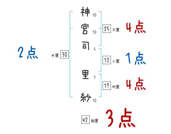 天運![]() | 神宮司里紗さんの天運は25画の4つ星!個性があり才能があふれる。強運の持ち主で発展する。 家系が持つ宿命的な運勢を表します。祖先から受け継いだ苗字ですので自分の力が及びません。家柄を象徴します。 |