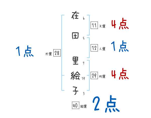 天運![]() | 在田里絵子さんの天運は11画の4つ星!着実に富や地位を得る幸運な人生。 家系が持つ宿命的な運勢を表します。祖先から受け継いだ苗字ですので自分の力が及びません。家柄を象徴します。 |