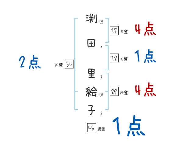 総運![]() | 渕田里絵子さんの総運は46画の1つ星!迷走することが多く苦労するかも。目先のことにとらわれないように。 あなたの人生を表す1番重要な運勢です。生涯を通じて影響する総合運となり、主に50歳以降の晩年期に影響を及ぼします。 |