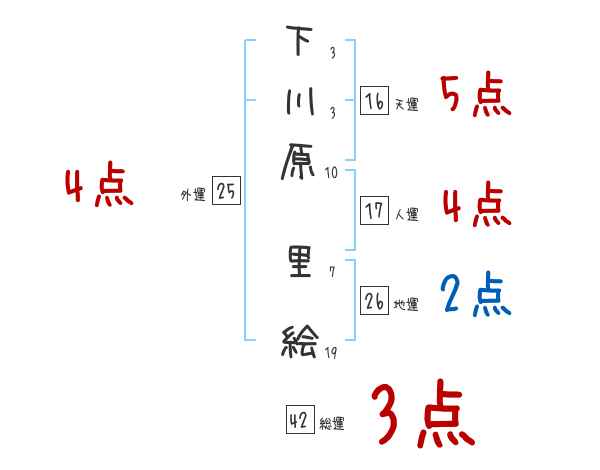 地運![]() | 下川原里絵さんの地運は26画の2つ星!波瀾万丈かも。信頼できる人を大事にしましょう。 個性を表す基礎的な運勢です。性格形成や対人関係、行動力など家庭環境に影響されます。主に誕生してから20歳くらいまでの若年期の運勢を表します。 |