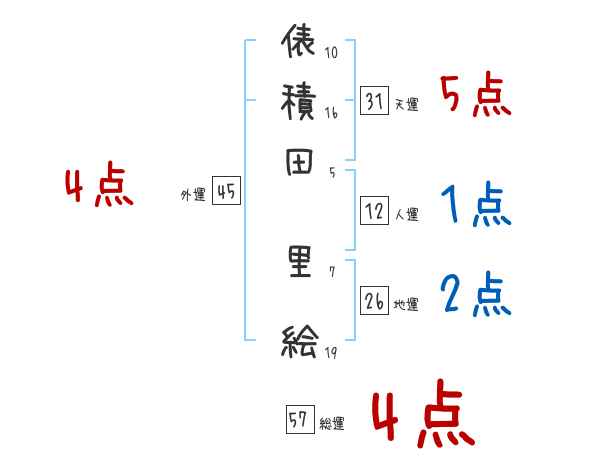 総運![]() | 俵積田里絵さんの総運は57画の4つ星!向上心があり人望がある。地位を得る。 あなたの人生を表す1番重要な運勢です。生涯を通じて影響する総合運となり、主に50歳以降の晩年期に影響を及ぼします。 |