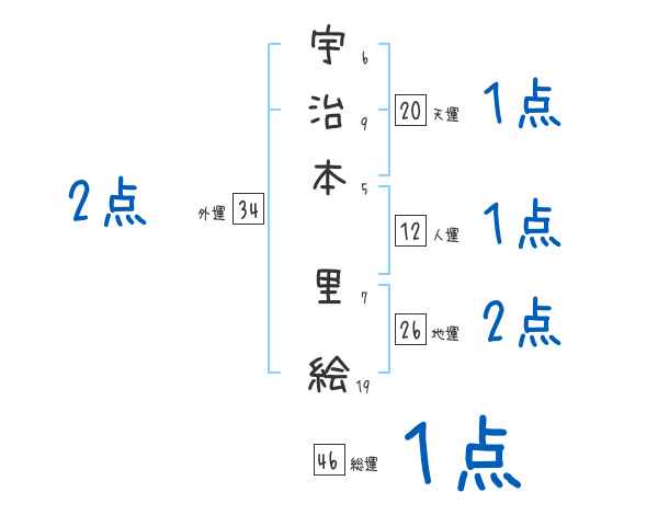 外運![]() | 宇治本里絵さんの外運は34画の2つ星!独創性に優れるが、自尊心が強く災難に注意しましょう。 生活面を象徴する運勢です。外部から受ける影響力を表し、結婚運、家庭運や職場、環境への順応性を表します。 |