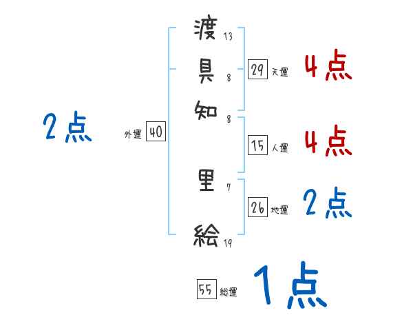 天運![]() | 渡具知里絵さんの天運は29画の4つ星!完全主義で才能がある。厳格な心の持ち主。 家系が持つ宿命的な運勢を表します。祖先から受け継いだ苗字ですので自分の力が及びません。家柄を象徴します。 |