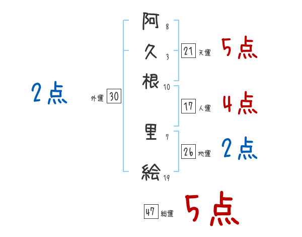 天運![]() | 阿久根里絵さんの天運は21画の5つ星!統率力がある。独立し成功する。名誉を手に入れる。 家系が持つ宿命的な運勢を表します。祖先から受け継いだ苗字ですので自分の力が及びません。家柄を象徴します。 |
