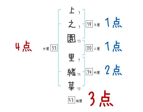 外運![]() | 上之園里緒菜さんの外運は33画の4つ星!権力志向でプライドが高い。勇気があり運を切り開き成功する。 生活面を象徴する運勢です。外部から受ける影響力を表し、結婚運、家庭運や職場、環境への順応性を表します。 |