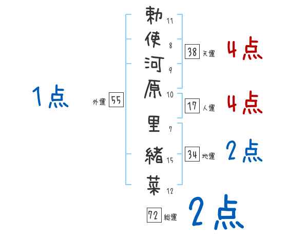 総運![]() | 勅使河原里緒菜さんの総運は72画の2つ星!災難が多く不安定な生活にならないように注意。明暗のある人生かも。 あなたの人生を表す1番重要な運勢です。生涯を通じて影響する総合運となり、主に50歳以降の晩年期に影響を及ぼします。 |