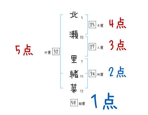 外運![]() | 北瀬里緒菜さんの外運は32画の5つ星!柔軟性があり成功する。チャンスが多く金運が良い。 生活面を象徴する運勢です。外部から受ける影響力を表し、結婚運、家庭運や職場、環境への順応性を表します。 |