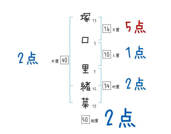 外運![]() | 塚口里緒菜さんの外運は40画の2つ星!自信過剰で物事に固執するためトラブルに注意。 生活面を象徴する運勢です。外部から受ける影響力を表し、結婚運、家庭運や職場、環境への順応性を表します。 |