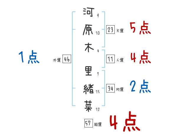 総運![]() | 河原木里緒菜さんの総運は57画の4つ星!向上心があり人望がある。地位を得る。 あなたの人生を表す1番重要な運勢です。生涯を通じて影響する総合運となり、主に50歳以降の晩年期に影響を及ぼします。 |