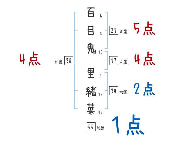 天運![]() | 百目鬼里緒菜さんの天運は21画の5つ星!統率力がある。独立し成功する。名誉を手に入れる。 家系が持つ宿命的な運勢を表します。祖先から受け継いだ苗字ですので自分の力が及びません。家柄を象徴します。 |