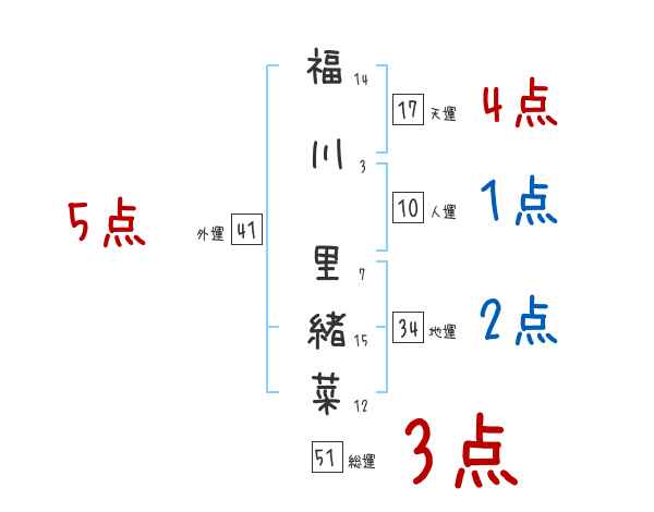 総運![]() | 福川里緒菜さんの総運は51画の3つ星!変化が激しく、危険に注意。堅実な性格。 あなたの人生を表す1番重要な運勢です。生涯を通じて影響する総合運となり、主に50歳以降の晩年期に影響を及ぼします。 |