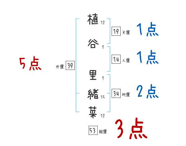 外運![]() | 植谷里緒菜さんの外運は39画の5つ星!社交性に優れ人望が厚い。人の上に立ち成功する。 生活面を象徴する運勢です。外部から受ける影響力を表し、結婚運、家庭運や職場、環境への順応性を表します。 |