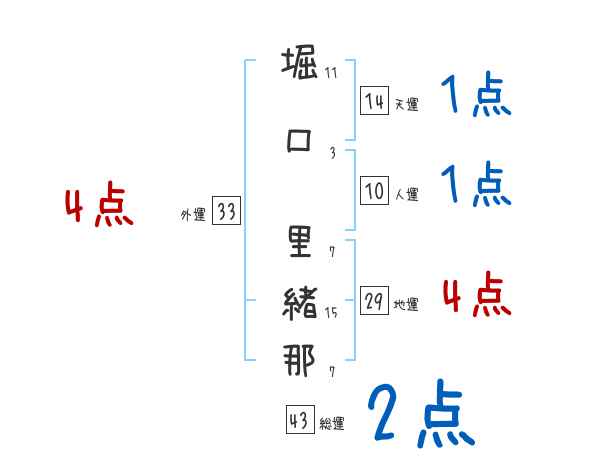 外運![]() | 堀口里緒那さんの外運は33画の4つ星!権力志向でプライドが高い。勇気があり運を切り開き成功する。 生活面を象徴する運勢です。外部から受ける影響力を表し、結婚運、家庭運や職場、環境への順応性を表します。 |