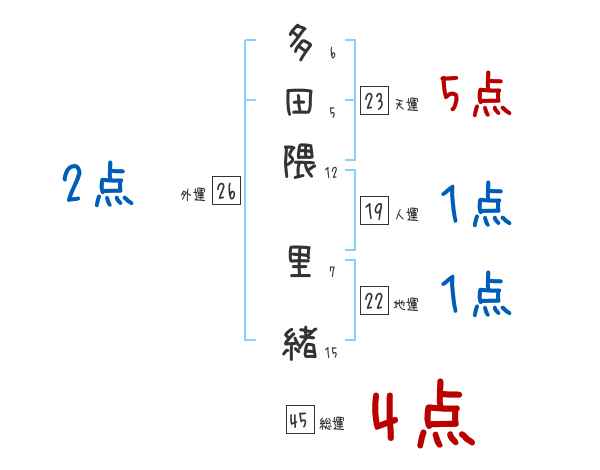 外運![]() | 多田隈里緒さんの外運は26画の2つ星!波瀾万丈かも。信頼できる人を大事にしましょう。 生活面を象徴する運勢です。外部から受ける影響力を表し、結婚運、家庭運や職場、環境への順応性を表します。 |