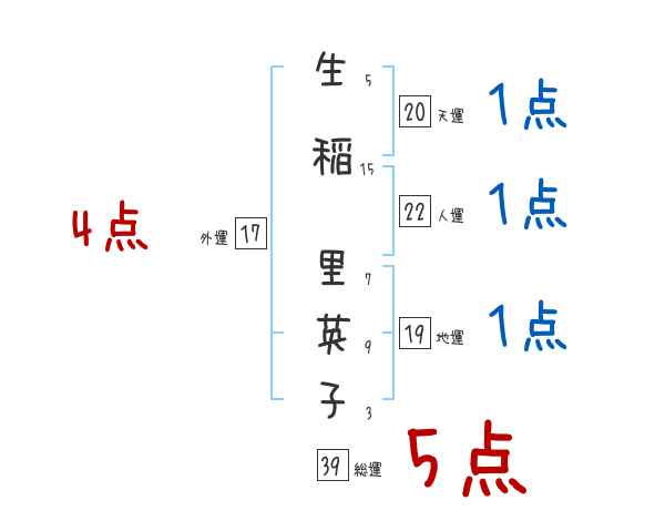 総運![]() | 生稲里英子さんの総運は39画の5つ星!社交性に優れ人望が厚い。人の上に立ち成功する。 あなたの人生を表す1番重要な運勢です。生涯を通じて影響する総合運となり、主に50歳以降の晩年期に影響を及ぼします。 |