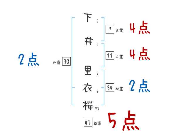 天運![]() | 下井里衣桜さんの天運は7画の4つ星!強い意志や信念を持ち独立心が強い。自立する。 家系が持つ宿命的な運勢を表します。祖先から受け継いだ苗字ですので自分の力が及びません。家柄を象徴します。 |