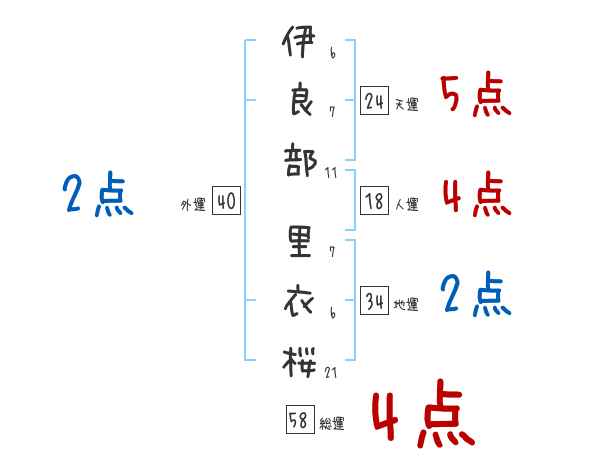 総運![]() | 伊良部里衣桜さんの総運は58画の4つ星!安定した生活。大器晩成タイプ。 あなたの人生を表す1番重要な運勢です。生涯を通じて影響する総合運となり、主に50歳以降の晩年期に影響を及ぼします。 |