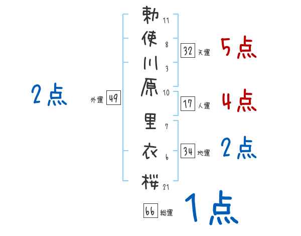 人運![]() | 勅使川原里衣桜さんの人運は17画の4つ星!積極的な行動力。地位を気づき財産を手に入れる。純粋な心と直感力。 性格や才能などを表す2番目に重要な運勢です。人間関係や協調性、社会的な成功に影響します。主に20歳から50歳ぐらいまでの中年期の運勢を表します。 |