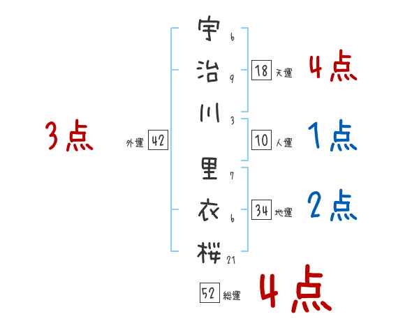 天運![]() | 宇治川里衣桜さんの天運は18画の4つ星!情熱的で剛気。忍耐力があり信頼される。 家系が持つ宿命的な運勢を表します。祖先から受け継いだ苗字ですので自分の力が及びません。家柄を象徴します。 |