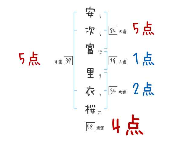 外運![]() | 安次富里衣桜さんの外運は39画の5つ星!社交性に優れ人望が厚い。人の上に立ち成功する。 生活面を象徴する運勢です。外部から受ける影響力を表し、結婚運、家庭運や職場、環境への順応性を表します。 |