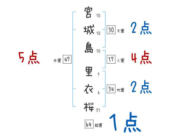 外運![]() | 宮城島里衣桜さんの外運は47画の5つ星!実力が開花し発展する円満な人生。財に恵まれる。 生活面を象徴する運勢です。外部から受ける影響力を表し、結婚運、家庭運や職場、環境への順応性を表します。 |