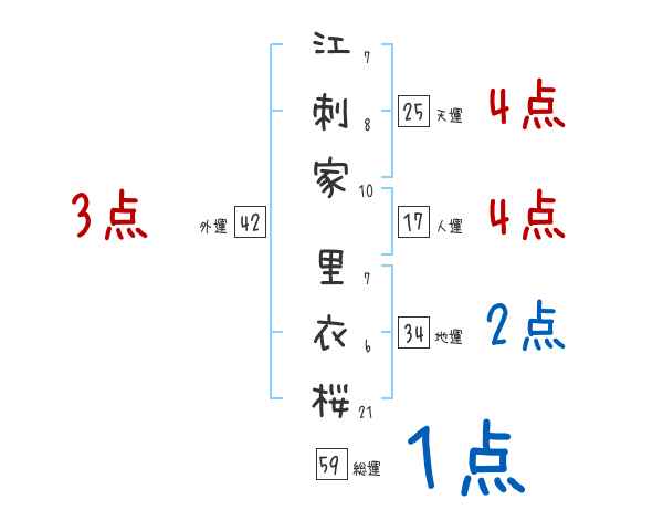 天運![]() | 江刺家里衣桜さんの天運は25画の4つ星!個性があり才能があふれる。強運の持ち主で発展する。 家系が持つ宿命的な運勢を表します。祖先から受け継いだ苗字ですので自分の力が及びません。家柄を象徴します。 |