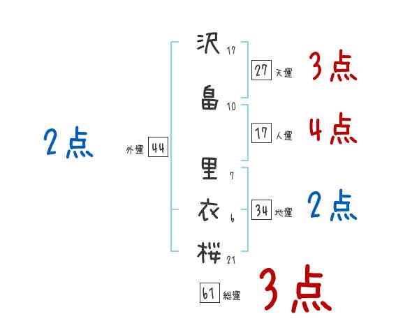 人運![]() | 沢畠里衣桜さんの人運は17画の4つ星!積極的な行動力。地位を気づき財産を手に入れる。純粋な心と直感力。 性格や才能などを表す2番目に重要な運勢です。人間関係や協調性、社会的な成功に影響します。主に20歳から50歳ぐらいまでの中年期の運勢を表します。 |