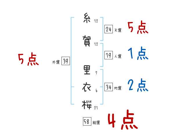 外運![]() | 糸賀里衣桜さんの外運は39画の5つ星!社交性に優れ人望が厚い。人の上に立ち成功する。 生活面を象徴する運勢です。外部から受ける影響力を表し、結婚運、家庭運や職場、環境への順応性を表します。 |