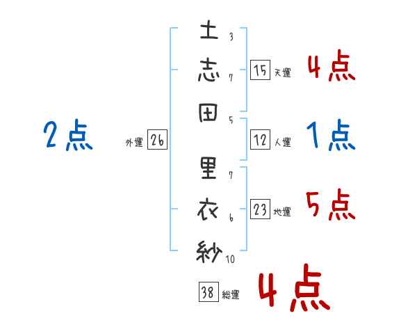 外運![]() | 土志田里衣紗さんの外運は26画の2つ星!波瀾万丈かも。信頼できる人を大事にしましょう。 生活面を象徴する運勢です。外部から受ける影響力を表し、結婚運、家庭運や職場、環境への順応性を表します。 |