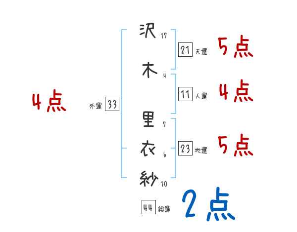 外運![]() | 沢木里衣紗さんの外運は33画の4つ星!権力志向でプライドが高い。勇気があり運を切り開き成功する。 生活面を象徴する運勢です。外部から受ける影響力を表し、結婚運、家庭運や職場、環境への順応性を表します。 |