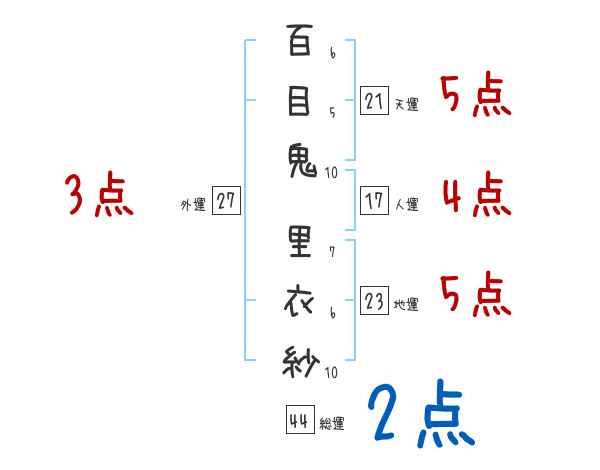 天運![]() | 百目鬼里衣紗さんの天運は21画の5つ星!統率力がある。独立し成功する。名誉を手に入れる。 家系が持つ宿命的な運勢を表します。祖先から受け継いだ苗字ですので自分の力が及びません。家柄を象徴します。 |