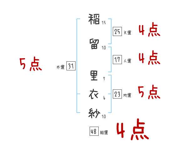 天運![]() | 稲留里衣紗さんの天運は25画の4つ星!個性があり才能があふれる。強運の持ち主で発展する。 家系が持つ宿命的な運勢を表します。祖先から受け継いだ苗字ですので自分の力が及びません。家柄を象徴します。 |