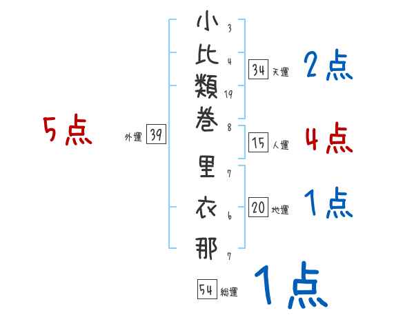 外運![]() | 小比類巻里衣那さんの外運は39画の5つ星!社交性に優れ人望が厚い。人の上に立ち成功する。 生活面を象徴する運勢です。外部から受ける影響力を表し、結婚運、家庭運や職場、環境への順応性を表します。 |