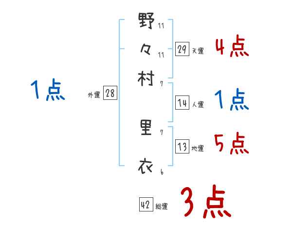 総運![]() | 野々村里衣さんの総運は42画の3つ星!病気に注意。多芸であるが消極的でおとなしい。 あなたの人生を表す1番重要な運勢です。生涯を通じて影響する総合運となり、主に50歳以降の晩年期に影響を及ぼします。 |