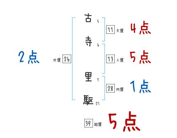 天運![]() | 古寺里駆さんの天運は11画の4つ星!着実に富や地位を得る幸運な人生。 家系が持つ宿命的な運勢を表します。祖先から受け継いだ苗字ですので自分の力が及びません。家柄を象徴します。 |