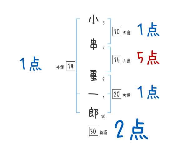 総運![]() | 小串重一郎さんの総運は30画の2つ星!浮き沈みの激しさに注意しましょう。 あなたの人生を表す1番重要な運勢です。生涯を通じて影響する総合運となり、主に50歳以降の晩年期に影響を及ぼします。 |