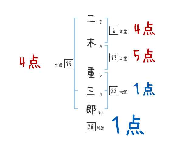 天運![]() | 二木重三郎さんの天運は6画の4つ星!慎重な努力家で信頼を得る。誠実な精神で向上心に優れる。 家系が持つ宿命的な運勢を表します。祖先から受け継いだ苗字ですので自分の力が及びません。家柄を象徴します。 |