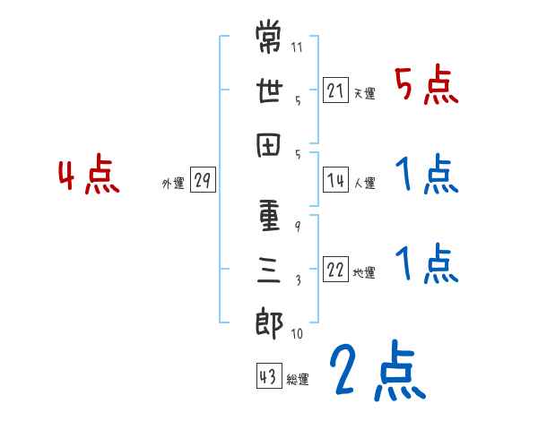 天運![]() | 常世田重三郎さんの天運は21画の5つ星!統率力がある。独立し成功する。名誉を手に入れる。 家系が持つ宿命的な運勢を表します。祖先から受け継いだ苗字ですので自分の力が及びません。家柄を象徴します。 |
